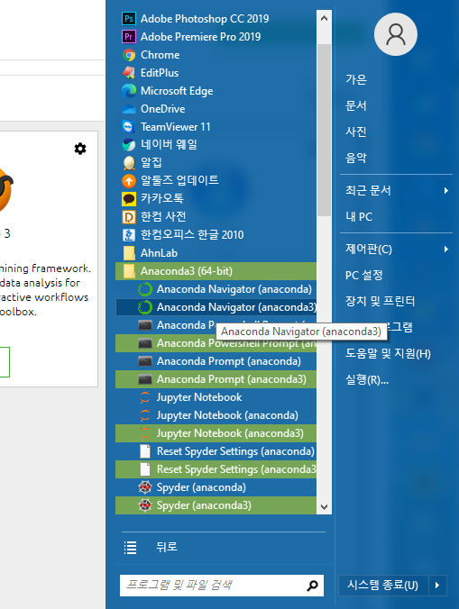 설치 완료 후 윈도우 시작 버튼 클릭한후
